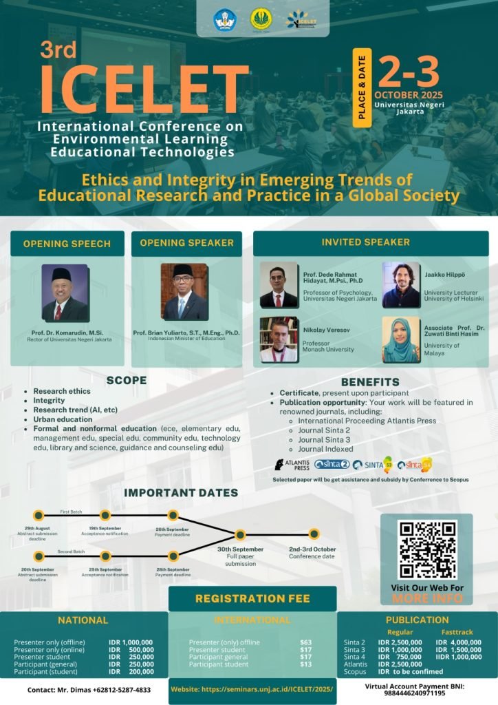 The 3rd International Conference on Environmental Learning and Educational Technologies (ICELET 2025) will be held on October 2–3, 2025, hosted by the Faculty of Education, Universitas Negeri Jakarta, Indonesia. ICELET is an annual academic forum that brings together researchers, educators, practitioners, and policy-makers from around the globe to share insights, innovations, and research findings at the intersection of environmental learning and educational technologies.